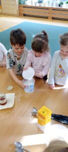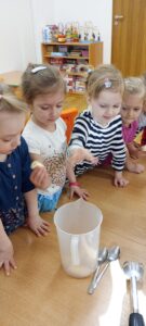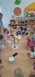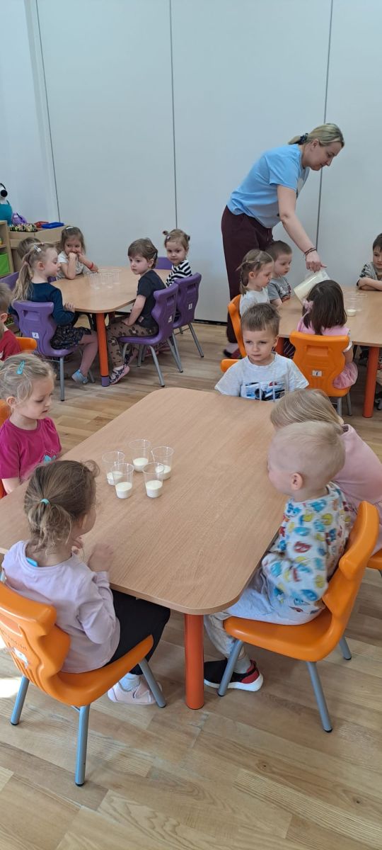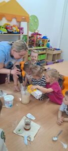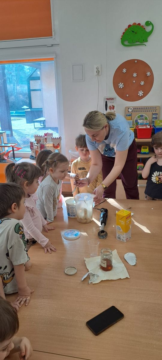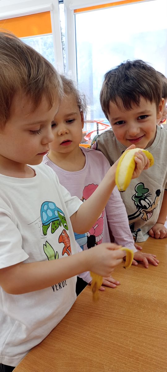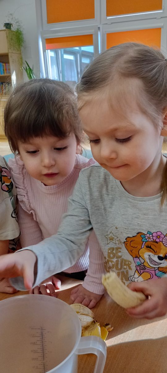 11 marca dzieci z grupy „Dinozaury” z myślą o witaminkach i zdrowym odżywianiu przygotowały koktajl owocowy z bananów. Przed przystąpieniem do pracy przedszkolaki umyły ręce, przygotowały składniki i zapoznały się z urządzeniem do robienia koktajlu. Gotowe do pracy zaczęły kroić banany i wrzucać do blendera i resztę składników. Celem zajęć było zachęcenie dzieci do spożywania owoców i zapoznanie dzieci z możliwością spożywania owoców w innej postaci. Na koniec wszystkich czekała degustacja. Okazało się, że dzieci chętnie smakowały i prosiły o kolejną porcję koktajlu i jesteśmy umówieni na kolejny koktajl o smaku mango 😊