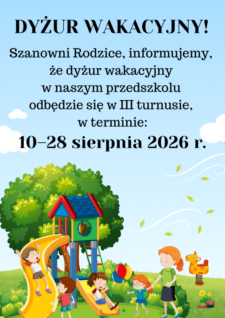 Szanowni Państwo, od jutra 18 marca od godziny 12.00 rozpoczynają się zapisy na dyżur wakacyjny 2026. Potrwają one do 3 kwietnia do godziny 20.00. Przypominamy, że dyżur wakacyjny ...