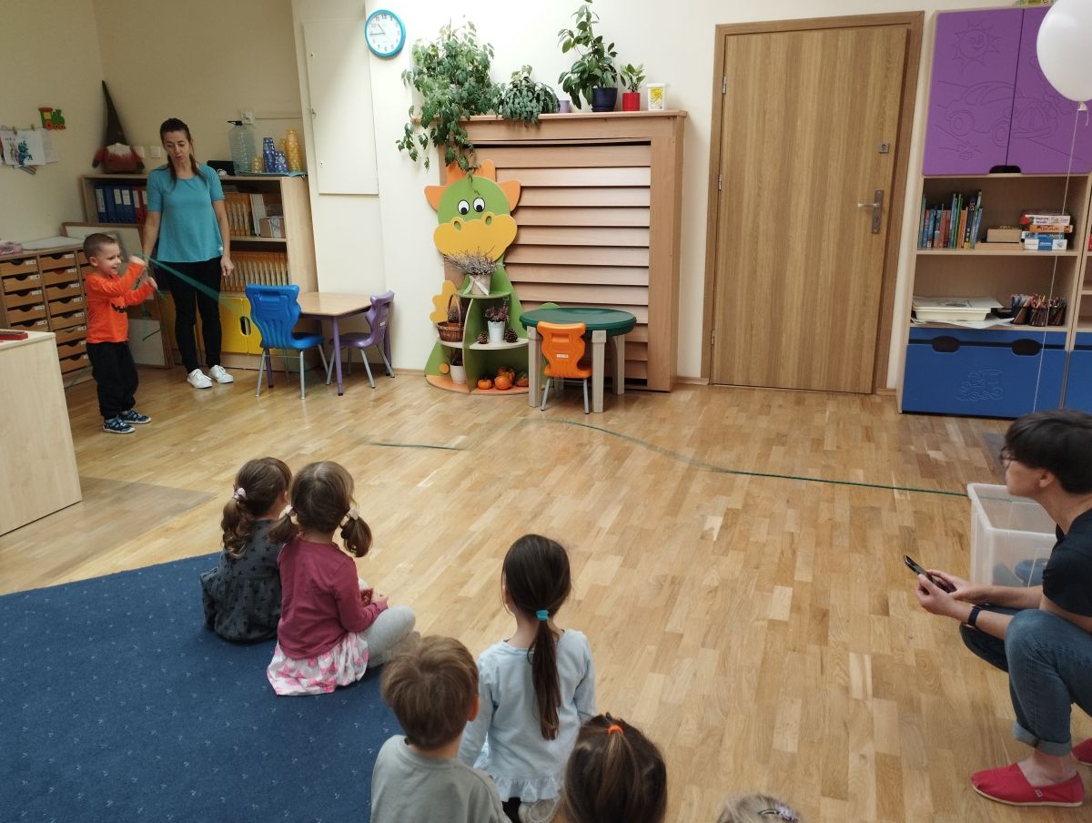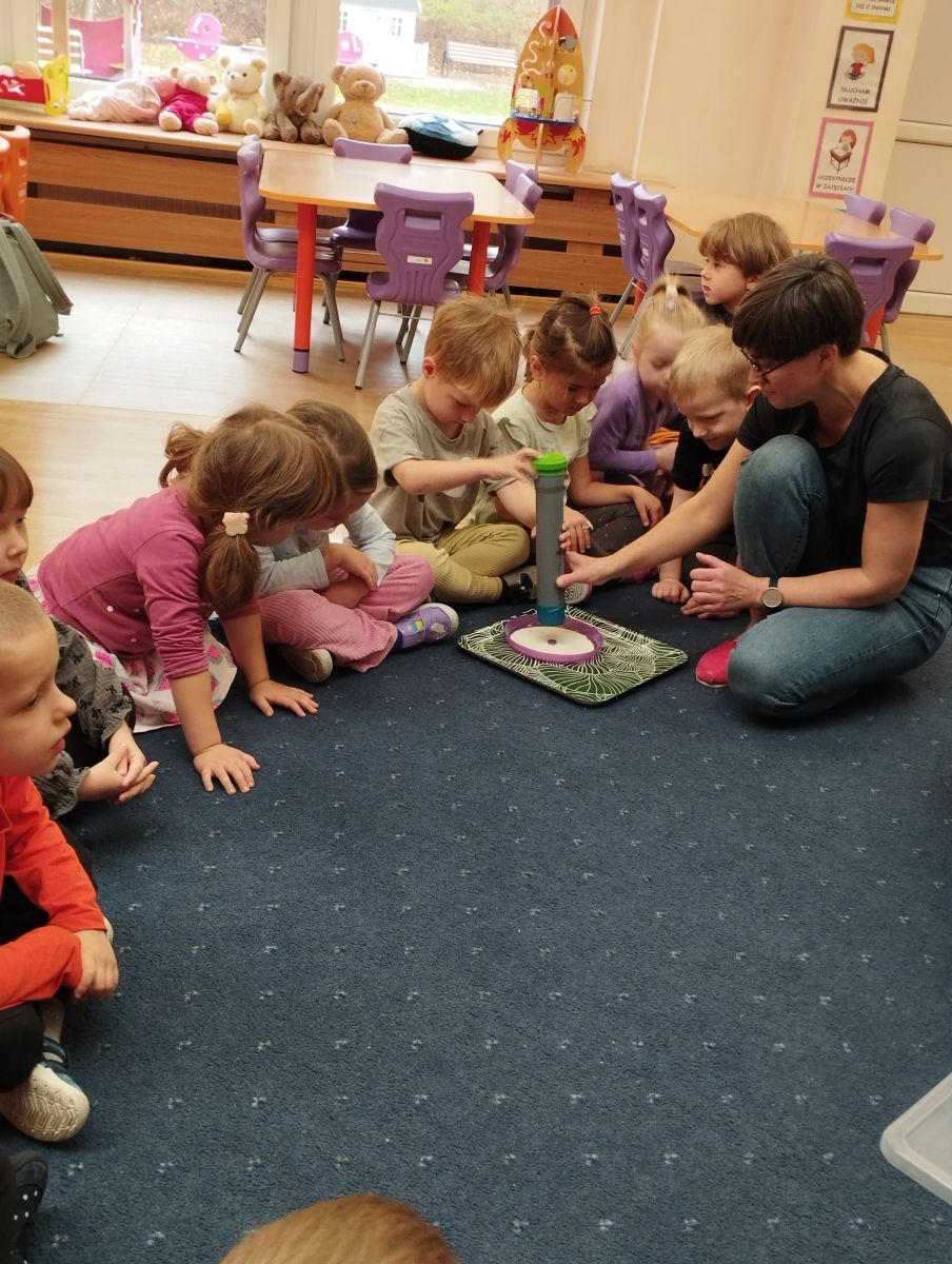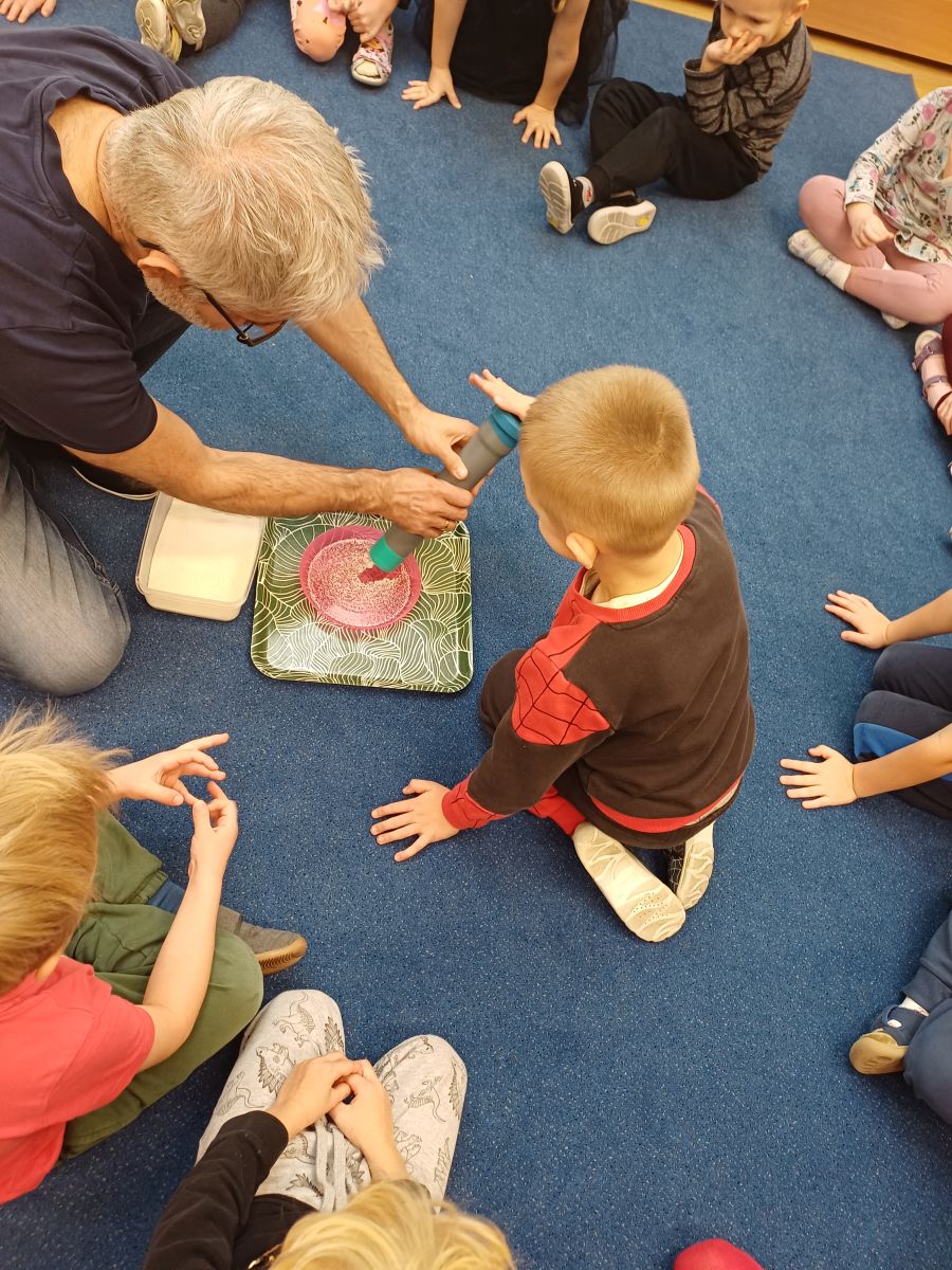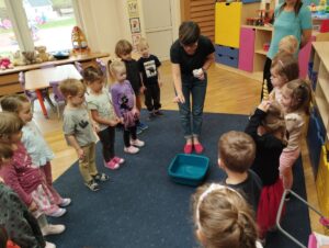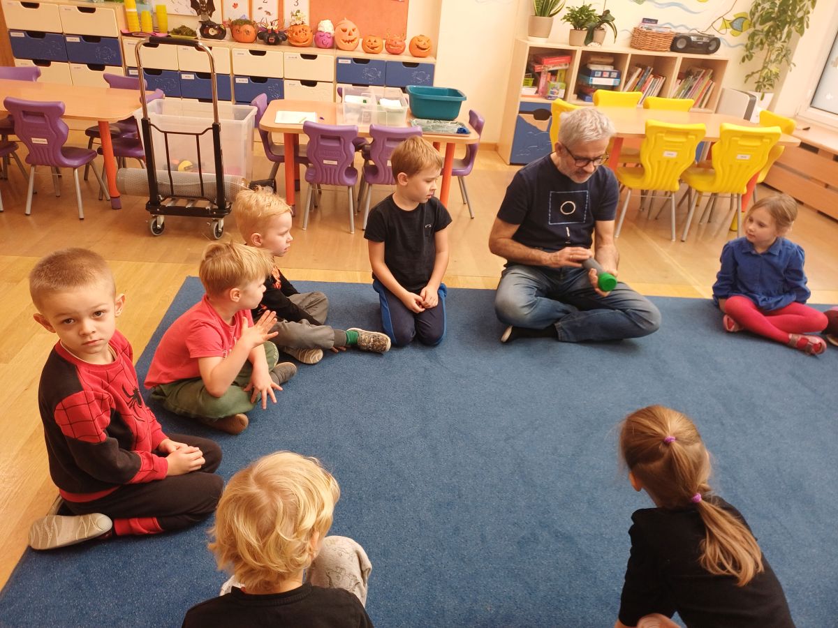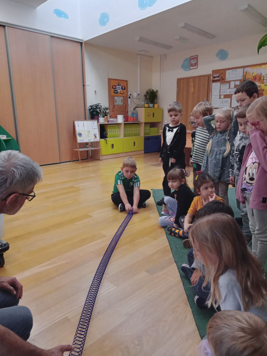 W piątek 31 października przedszkolaki uczestniczyły w kolejnym spotkaniu z Karuzelą Eksperymentów. Dzieci podczas różnych doświadczeń dowiedziały się jak powstaje dźwięk, jak rozchodzą się dźwięki i dzięki czemu je słyszymy. Dużo radości sprawiła im prezentacja z helem w baloniku. Zmieniony głos prowadzącego wywołał zdziwienie i entuzjazm u przedszkolaków. Bardzo podobał się również eksperyment, w którym dzieci mogły przy pomocy dźwięku zgasić płomień, a nawet poruszyć rozsypaną na talerzu kaszą manną. Natomiast doświadczenie z rozciągniętą plastikową sprężyną pokazało przedszkolakom jak rozchodzi się dźwięk. Każdy chciał spróbować wywołanie fali poruszającej się wzdłuż sprężyny. Zabawa z liną uświadomiła dzieciom jakie fale ma dźwięk, gdy muzyka jest głośna, a jakie gdy cicha. Dziękujemy za przybliżenie przedszkolakom zagadnień związanych z akustyką. Czekamy z niecierpliwością na kolejne spotkanie z Karuzelą Eksperymentów.