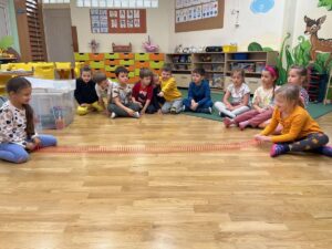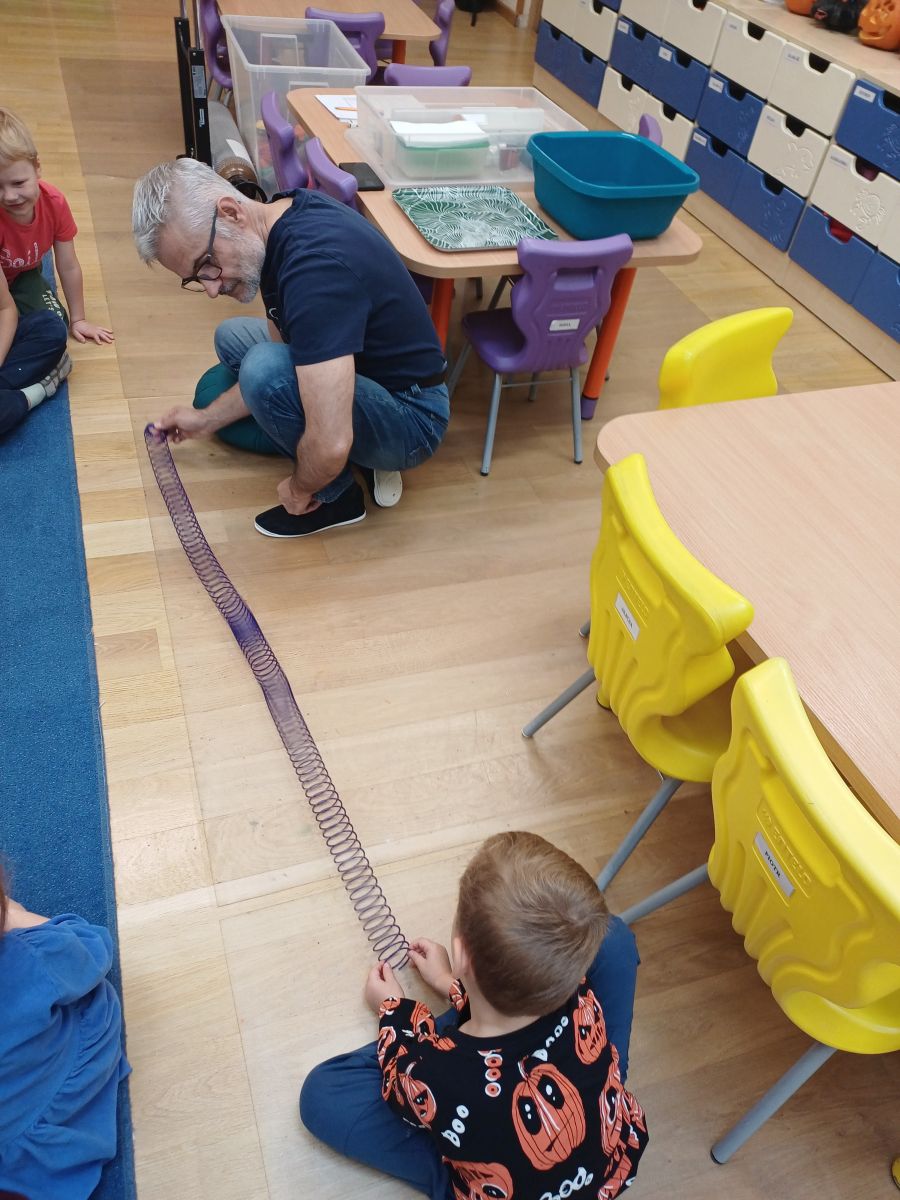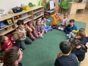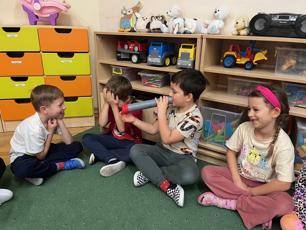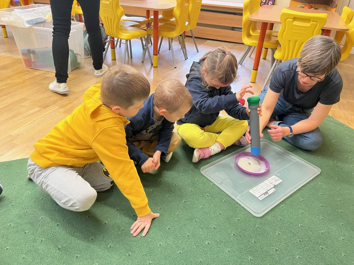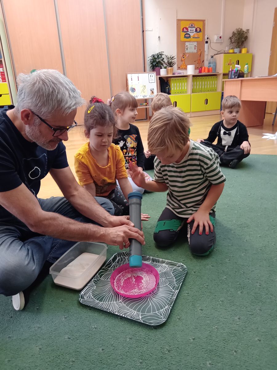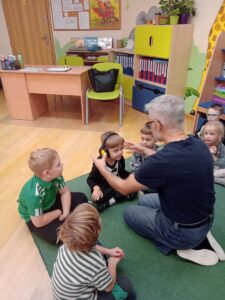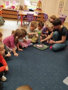 W piątek 31 października przedszkolaki uczestniczyły w kolejnym spotkaniu z Karuzelą Eksperymentów. Dzieci podczas różnych doświadczeń dowiedziały się jak powstaje dźwięk, jak rozchodzą się dźwięki i dzięki czemu je słyszymy. Dużo radości sprawiła im prezentacja z helem w baloniku. Zmieniony głos prowadzącego wywołał zdziwienie i entuzjazm u przedszkolaków. Bardzo podobał się również eksperyment, w którym dzieci mogły przy pomocy dźwięku zgasić płomień, a nawet poruszyć rozsypaną na talerzu kaszą manną. Natomiast doświadczenie z rozciągniętą plastikową sprężyną pokazało przedszkolakom jak rozchodzi się dźwięk. Każdy chciał spróbować wywołanie fali poruszającej się wzdłuż sprężyny. Zabawa z liną uświadomiła dzieciom jakie fale ma dźwięk, gdy muzyka jest głośna, a jakie gdy cicha. Dziękujemy za przybliżenie przedszkolakom zagadnień związanych z akustyką. Czekamy z niecierpliwością na kolejne spotkanie z Karuzelą Eksperymentów.