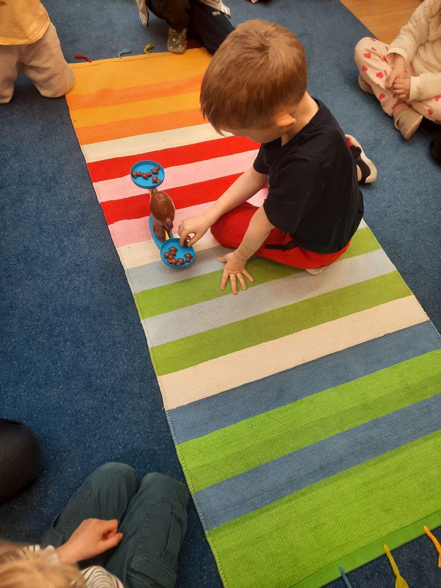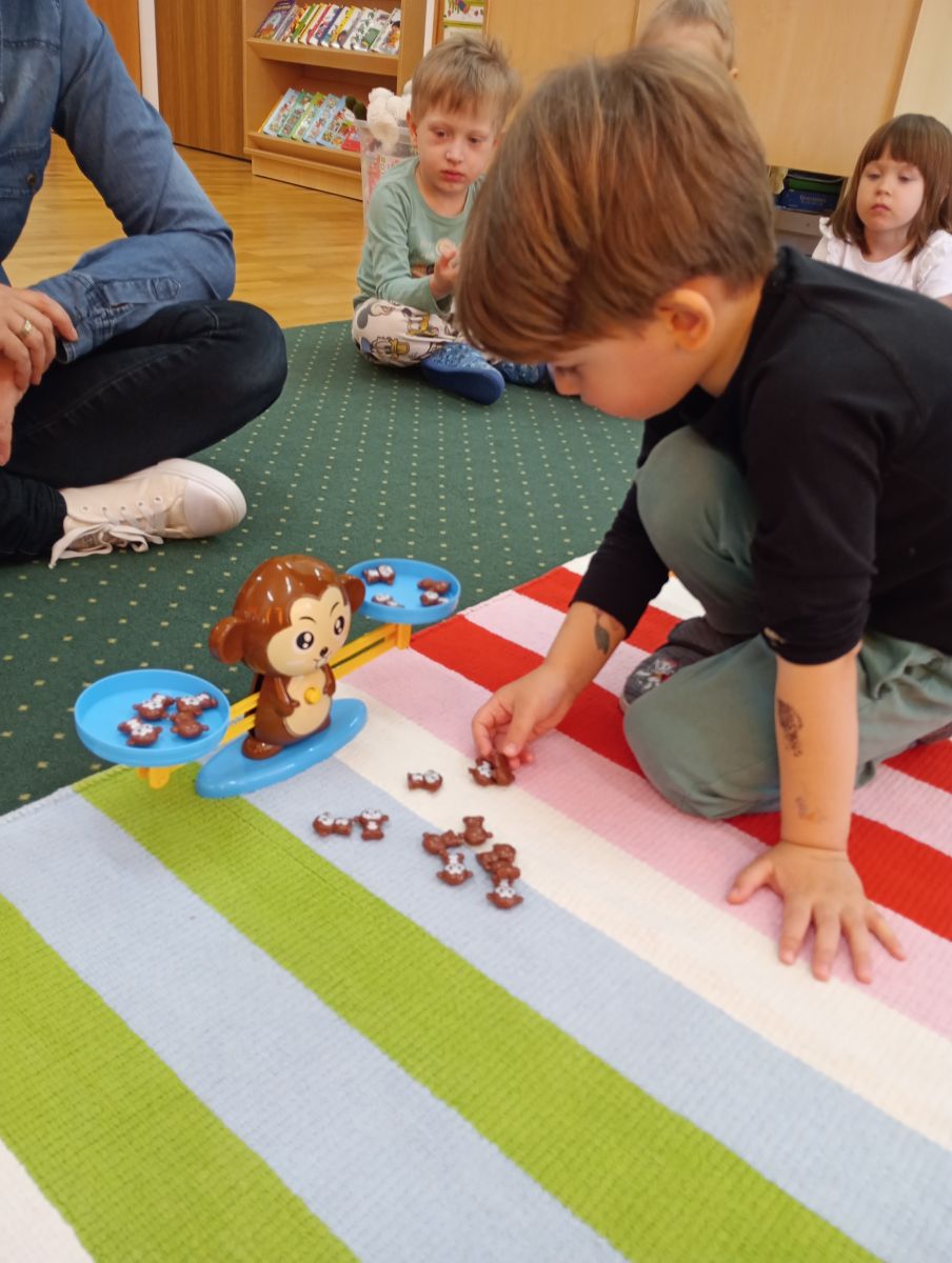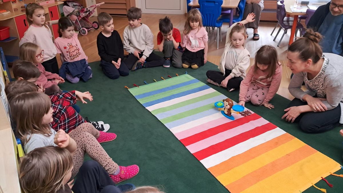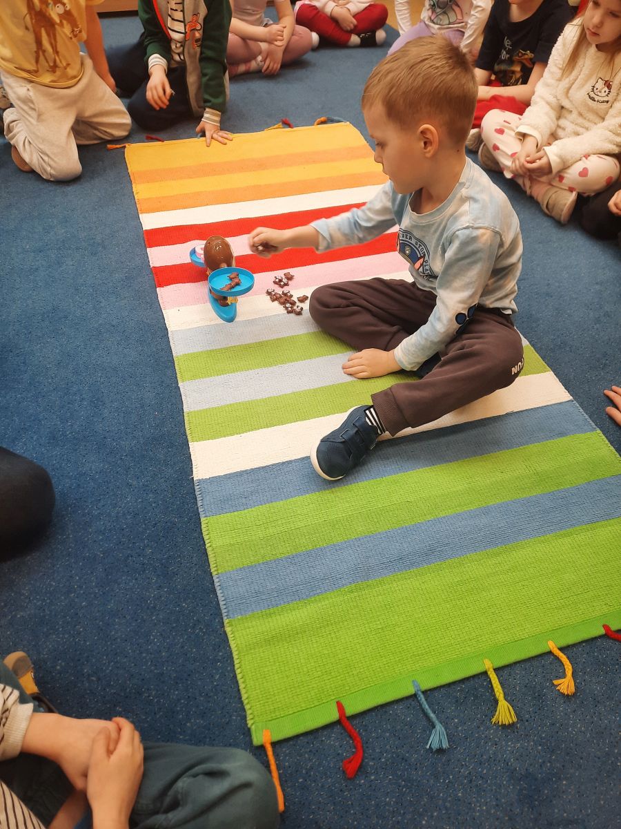 W dniach 9 i 10 kwietnia odbyła się Karuzela matematyczna pt. „Równanie na dywanie”. Podczas zajęć dzieci uczestniczyły w różnorodnych aktywnościach edukacyjnych. Przedszkolaki posługiwały się wagą szalkową, dzięki której uczyły się porównywać ciężar przedmiotów, określając zależności: „równo”, „więcej”, „mniej”. Działania te pozwoliły dzieciom w praktyczny sposób zrozumieć pojęcie równowagi. Kolejnym zadaniem było porównywanie przedmiotów znajdujących się na dwóch tacach. Dzieci analizowały ich zawartość i odpowiadały na pytanie „czego brakuje?”, rozwijając spostrzegawczość oraz umiejętność logicznego wnioskowania. Dużym zainteresowaniem cieszyły się również zabawy z tzw. „panem x”, czyli wprowadzenie do prostych równań matematycznych. Dzieci rozwiązywały zadania w formie zabawy, np. 2 + x = 5, poszukując brakującej liczby i odkrywając zależności między elementami działania.