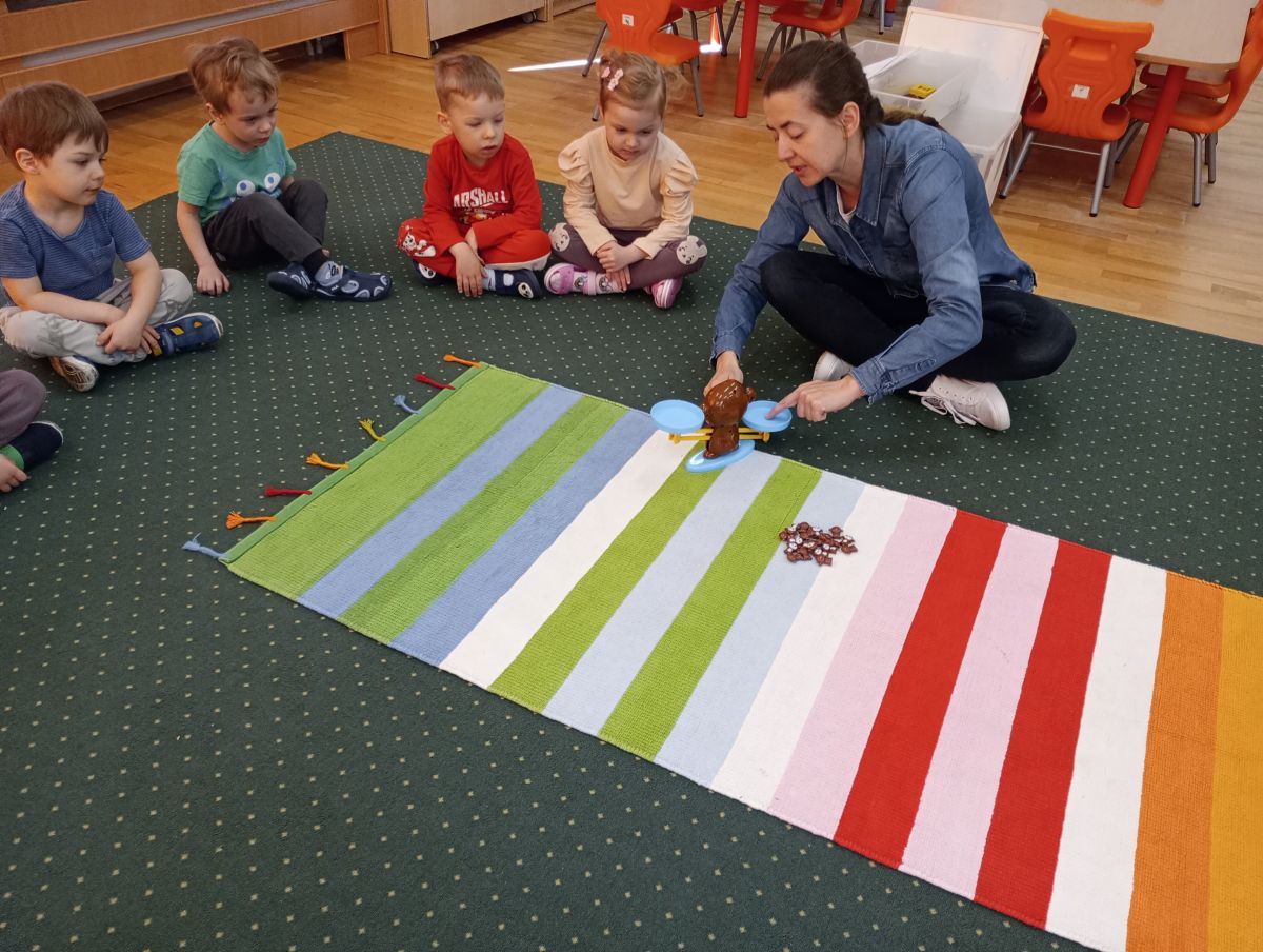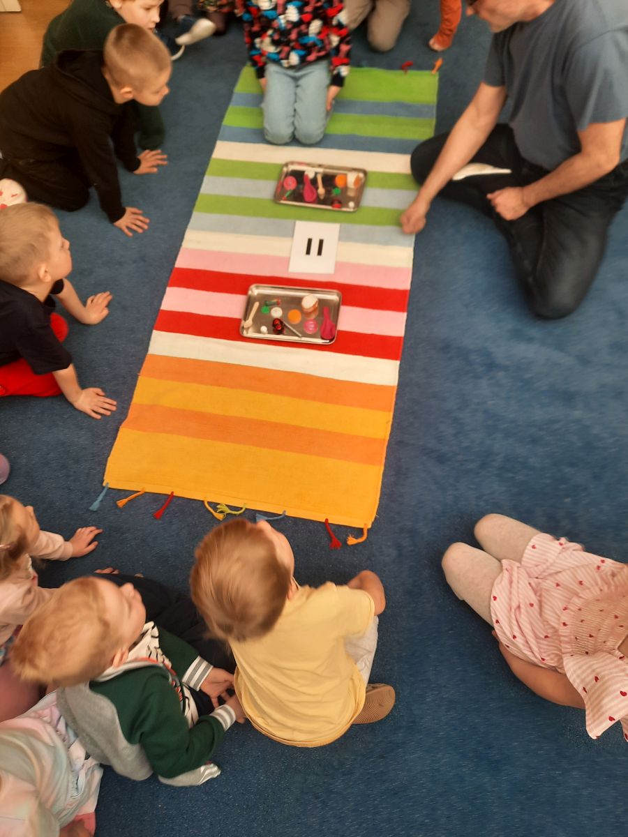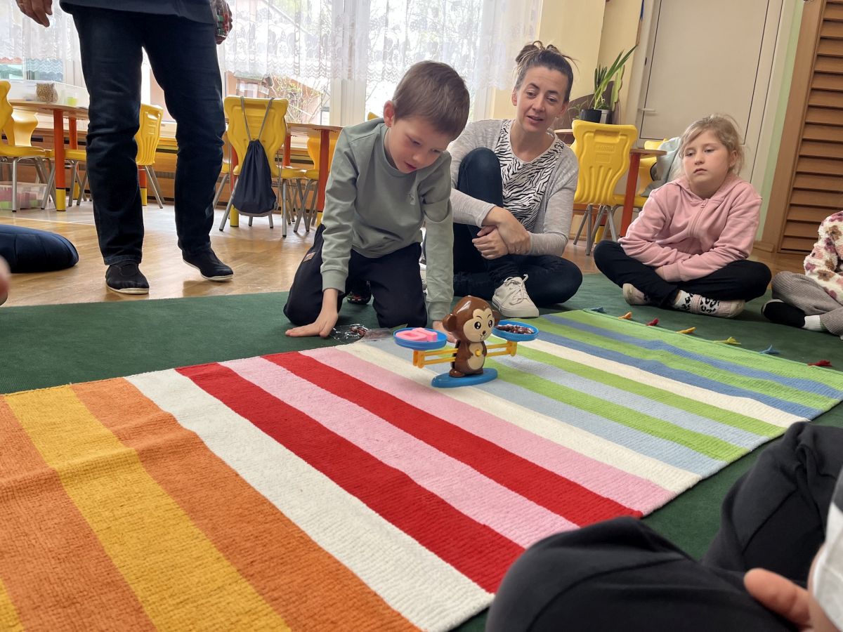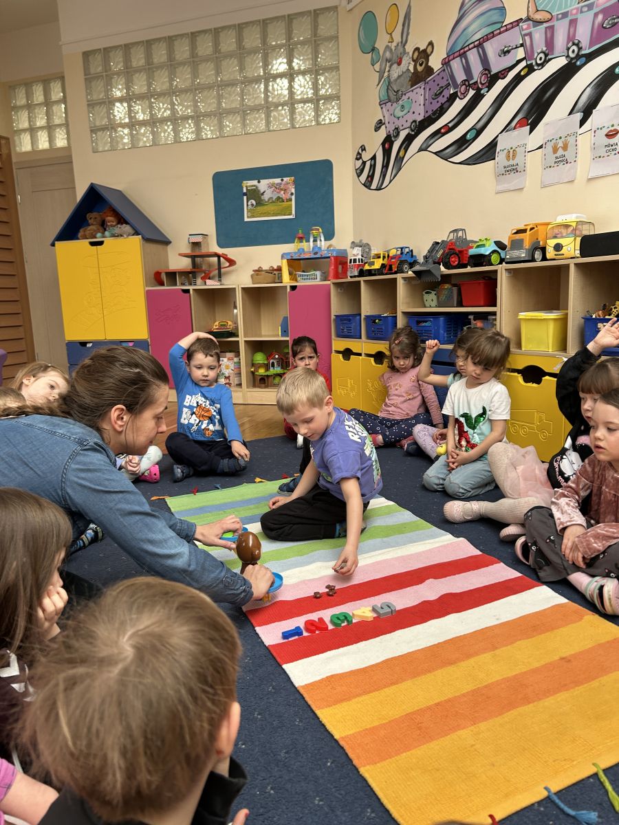 W dniach 9 i 10 kwietnia odbyła się Karuzela matematyczna pt. „Równanie na dywanie”. Podczas zajęć dzieci uczestniczyły w różnorodnych aktywnościach edukacyjnych. Przedszkolaki posługiwały się wagą szalkową, dzięki której uczyły się porównywać ciężar przedmiotów, określając zależności: „równo”, „więcej”, „mniej”. Działania te pozwoliły dzieciom w praktyczny sposób zrozumieć pojęcie równowagi. Kolejnym zadaniem było porównywanie przedmiotów znajdujących się na dwóch tacach. Dzieci analizowały ich zawartość i odpowiadały na pytanie „czego brakuje?”, rozwijając spostrzegawczość oraz umiejętność logicznego wnioskowania. Dużym zainteresowaniem cieszyły się również zabawy z tzw. „panem x”, czyli wprowadzenie do prostych równań matematycznych. Dzieci rozwiązywały zadania w formie zabawy, np. 2 + x = 5, poszukując brakującej liczby i odkrywając zależności między elementami działania.