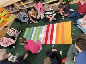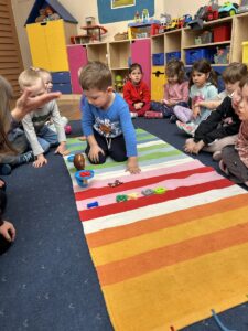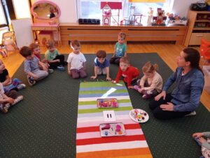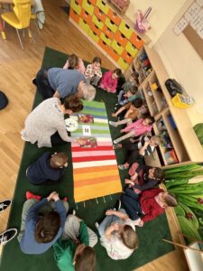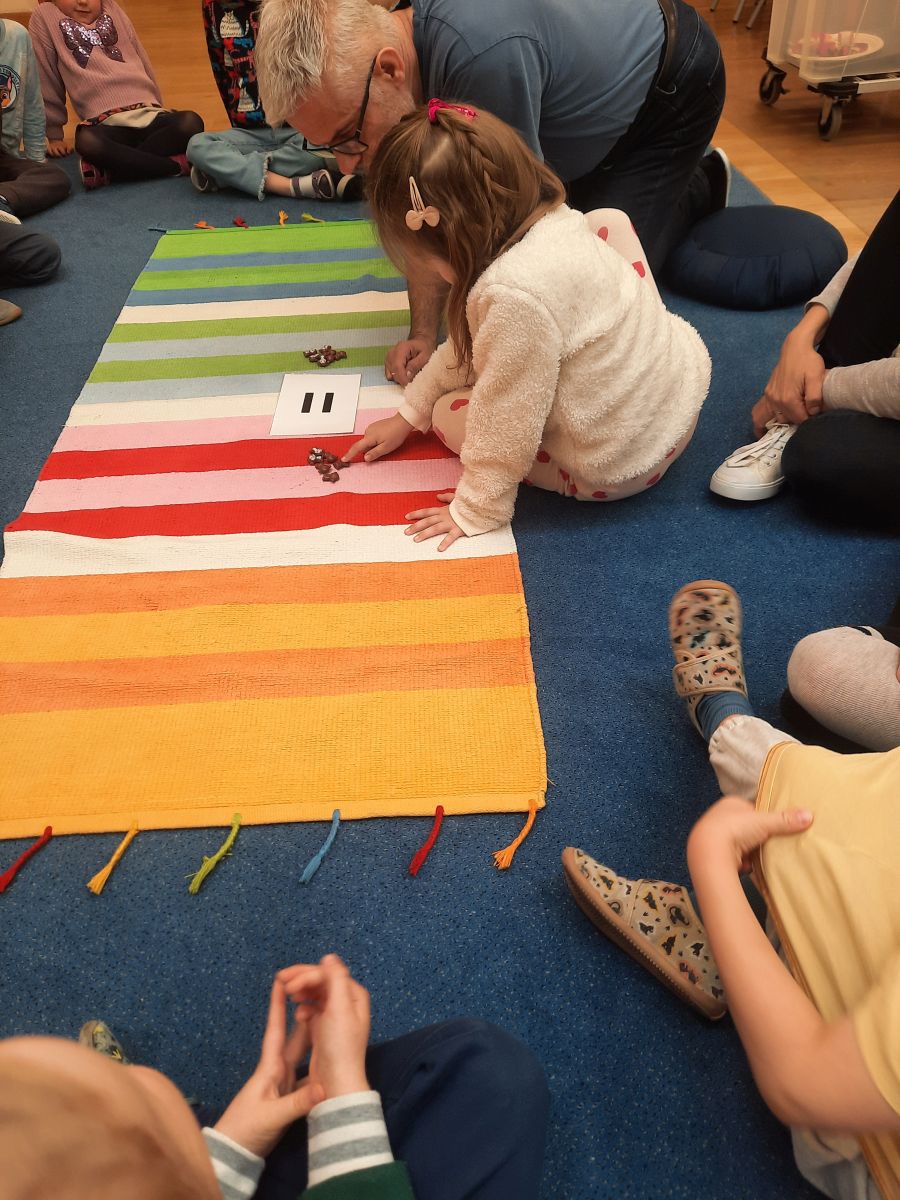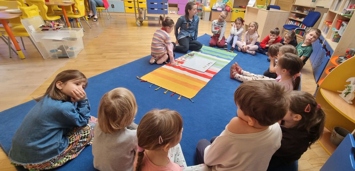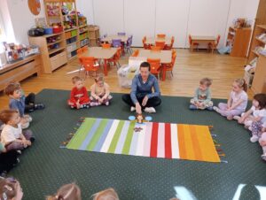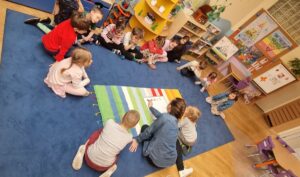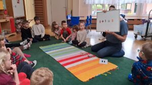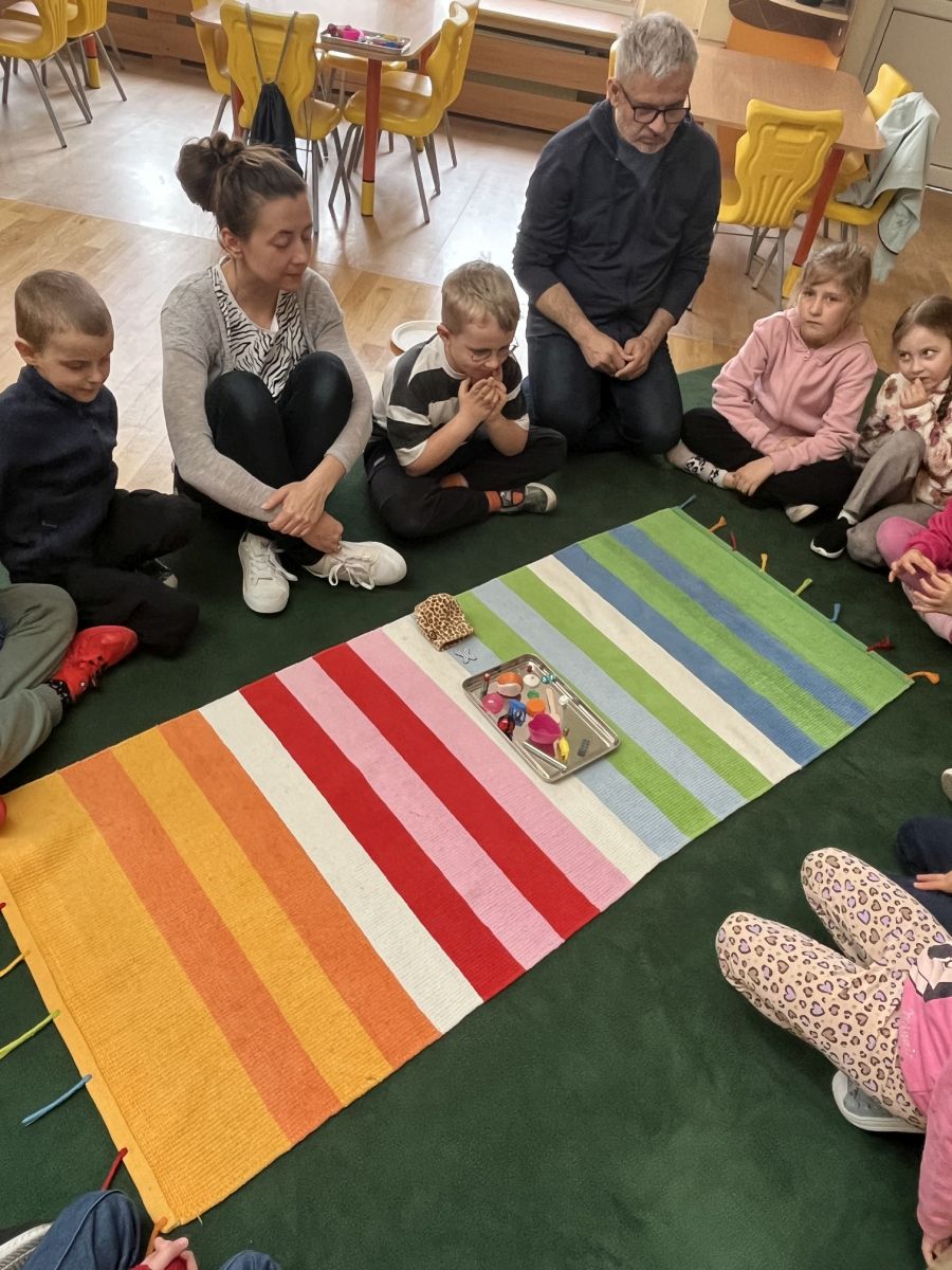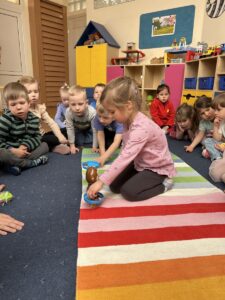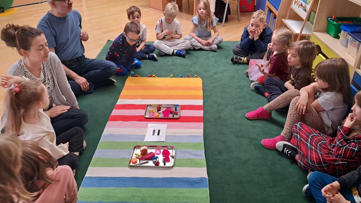 W dniach 9 i 10 kwietnia odbyła się Karuzela matematyczna pt. „Równanie na dywanie”. Podczas zajęć dzieci uczestniczyły w różnorodnych aktywnościach edukacyjnych. Przedszkolaki posługiwały się wagą szalkową, dzięki której uczyły się porównywać ciężar przedmiotów, określając zależności: „równo”, „więcej”, „mniej”. Działania te pozwoliły dzieciom w praktyczny sposób zrozumieć pojęcie równowagi. Kolejnym zadaniem było porównywanie przedmiotów znajdujących się na dwóch tacach. Dzieci analizowały ich zawartość i odpowiadały na pytanie „czego brakuje?”, rozwijając spostrzegawczość oraz umiejętność logicznego wnioskowania. Dużym zainteresowaniem cieszyły się również zabawy z tzw. „panem x”, czyli wprowadzenie do prostych równań matematycznych. Dzieci rozwiązywały zadania w formie zabawy, np. 2 + x = 5, poszukując brakującej liczby i odkrywając zależności między elementami działania.