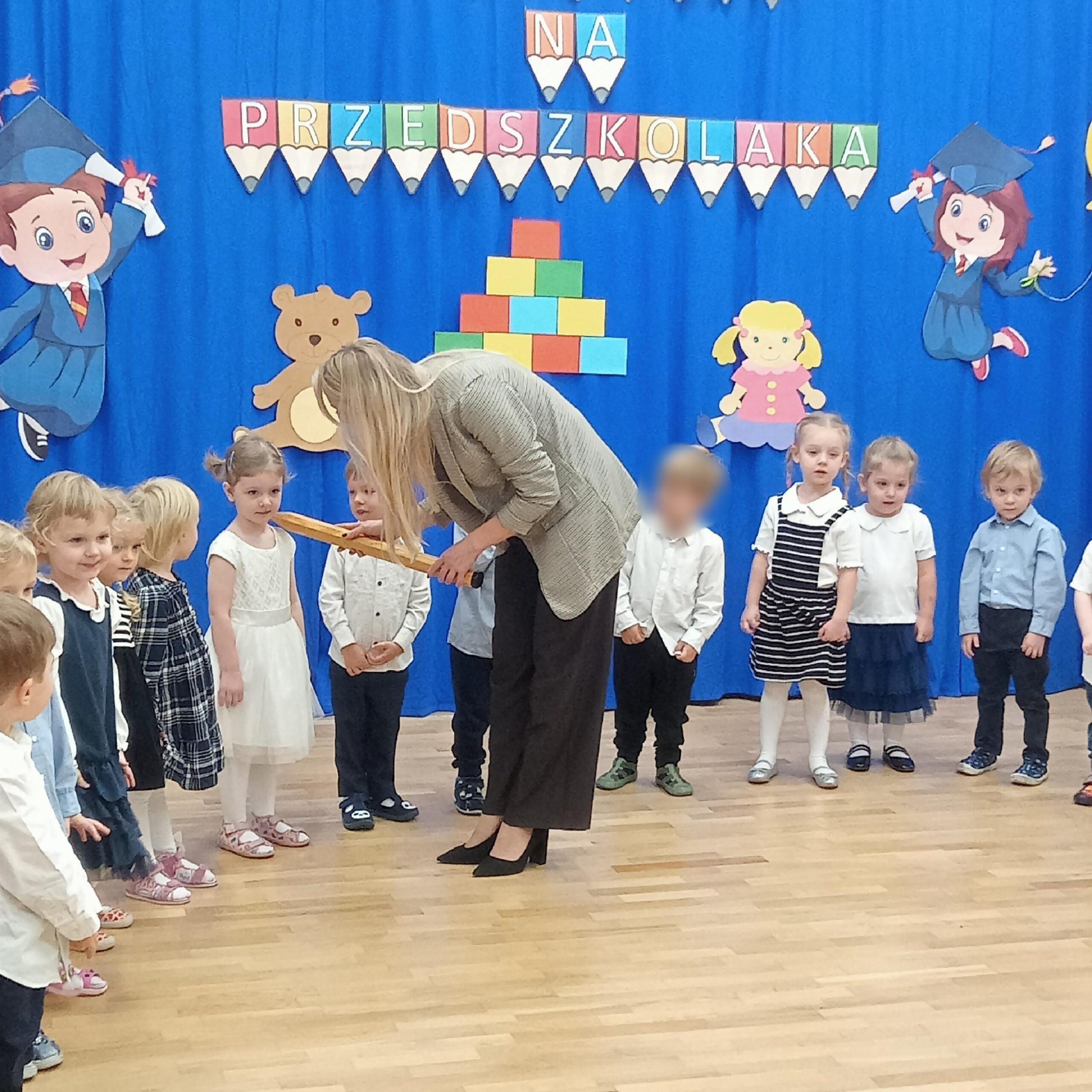 Po części artystycznej dzieci obiecały: zgodnie bawić się w przedszkolu, przychodzić każdego dnia z uśmiechem, słuchać pani i pomagać kolegom, być dzielnym przedszkolakiem. Po złożonej obietnicy Pani Dyrektor dokonała uroczystego pasowania każdego dziecka na przedszkolaka. Na pamiątkę tego ważnego wydarzenia każde dziecko otrzymało dyplom oraz prezent😊