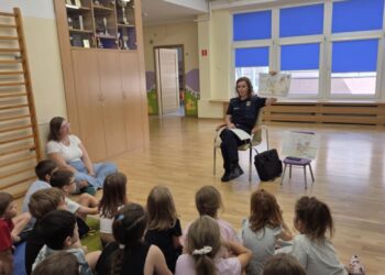 Dnia 05.08.2025 r. grupy 5 i 6 latków, brały udział w spotkaniu ze Strażnikiem Miejskim na temat bezpieczeństwa nad wodą. Pani ze Straży Miejskiej opowiedziała dzieciom o sytuacjach, ...