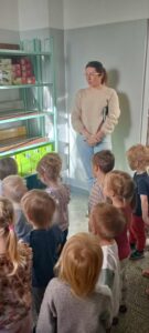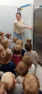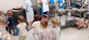 W dniu 4.11.2025 grupę „Dinozaury” odwiedziła Pani Jadzia pełniąca w naszym przedszkolu funkcję intendenta i zanana jest wszystkim dzieciom. Dzieci z zainteresowaniem słuchały wykładu o zdrowym odżywianiu. O warzywach i owocach tych pospolitych, które najczęściej spotykamy i wykorzystujemy w codziennych posiłkach w domu i przedszkolu. Poza tym Pani Jadzia opowiadała jak się tworzy jadłospis dla dzieci, i jakie kryteria są brane pod uwagę przy jego tworzeniu. Ponadto odbyła się rozmowa na temat roli i pracy intendenta w placówce. Po rozmowach wspólnie z Panią poszliśmy zobaczyć naszą przedszkolną kuchnie oraz magazynki w których przechowywane są produkty. Wyciągnęliśmy wnioski, że można jeść wszystko tylko z umiarem. Obiecaliśmy próbować wszystkiego. Na koniec stworzyliśmy własny jadłospis na 13.11.2025 (czwartek)😊