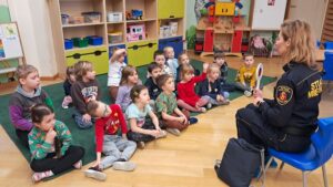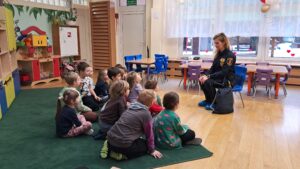 W dniu 13.02.2026 r. grupy 5 i 6 latków brały udział w spotkaniu ze Strażą Miejską. Podczas wizyty funkcjonariuszki opowiedziały o swojej pracy. Przedszkolaki poznały numer telefonu do Straży Miejskiej i dowiedziały się jak zgłaszać różnego rodzaju zdarzenia. Prowadząca omówiła również inne służby ratunkowe- pogotowie, straż pożarną i policję. Dzieci bardzo aktywnie uczestniczyły w spotkaniu, chętnie odpowiadały na pytania i dzieliły się swoimi spostrzeżeniami.