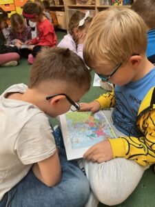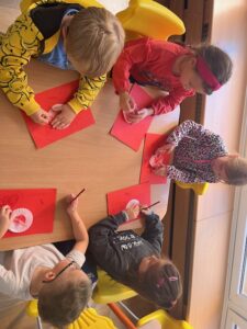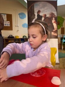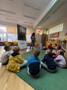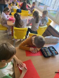 Podczas warsztatów w grupie Puszczyków- „Sześć obrazów” dla sześciolatków skupiliśmy się na dziele Artura Grottgera „Pożegnanie powstańca”. Spotkanie rozpoczęło się od krótkiej opowieści o artyście i wydarzeniach historycznych związanych z Powstaniem Styczniowym, przedstawionej w sposób dostosowany do wieku dzieci. Następnie dzieci przyglądały się obrazowi, rozmawiając o tym, co widzą i co czują – pojawiły się skojarzenia ze smutkiem, odwagą, rodziną i pożegnaniem. Przedszkolaki chętnie dzieliły się swoimi spostrzeżeniami, próbując zrozumieć emocje bohaterów przedstawionych na dziele. W części plastycznej dzieci tworzyły własne prace inspirowane tematem pożegnania kokardy narodowe. Na zakończenie warsztatów dzieci opowiadały, co najbardziej im się podobało i czego się nauczyły. Warsztaty okazały się nie tylko okazją do poznania historii, ale też do rozwijania empatii, wyobraźni i umiejętności wyrażania emocji poprzez sztukę.
