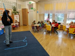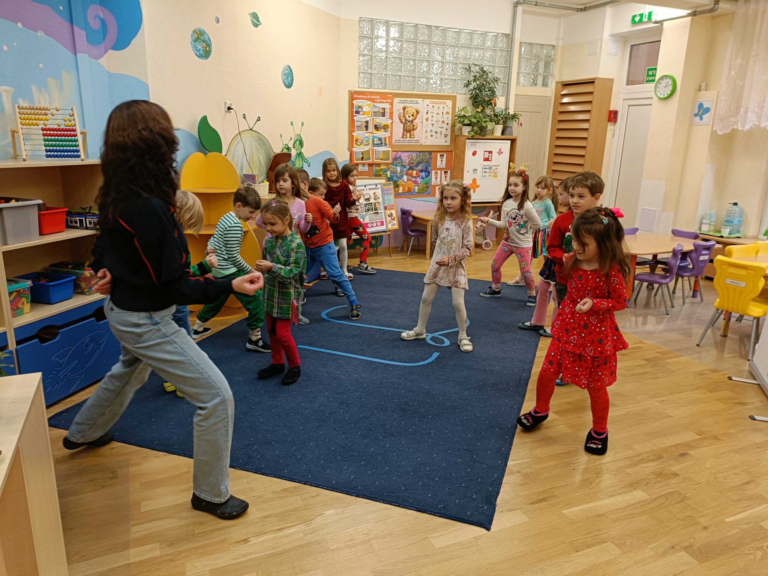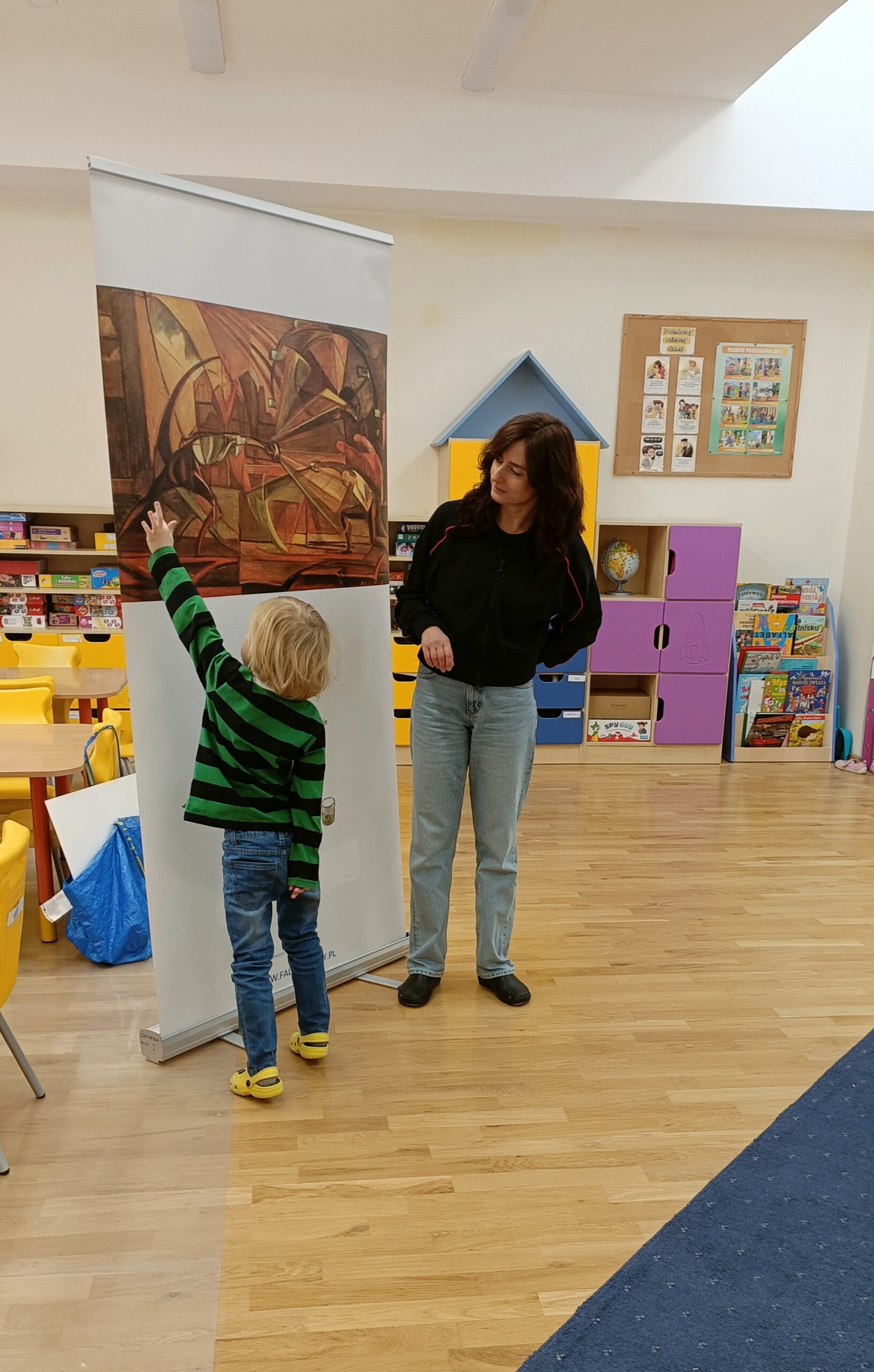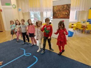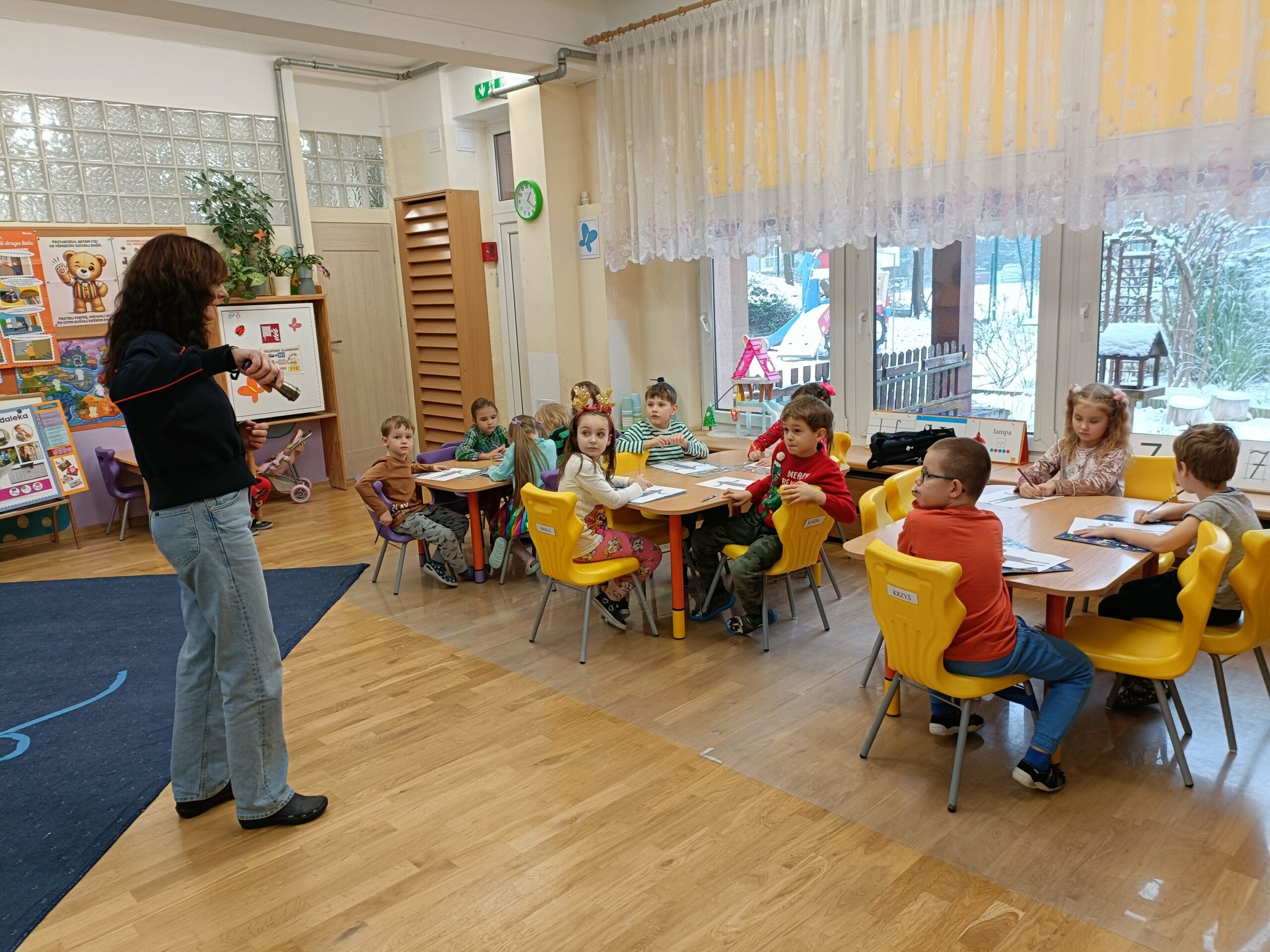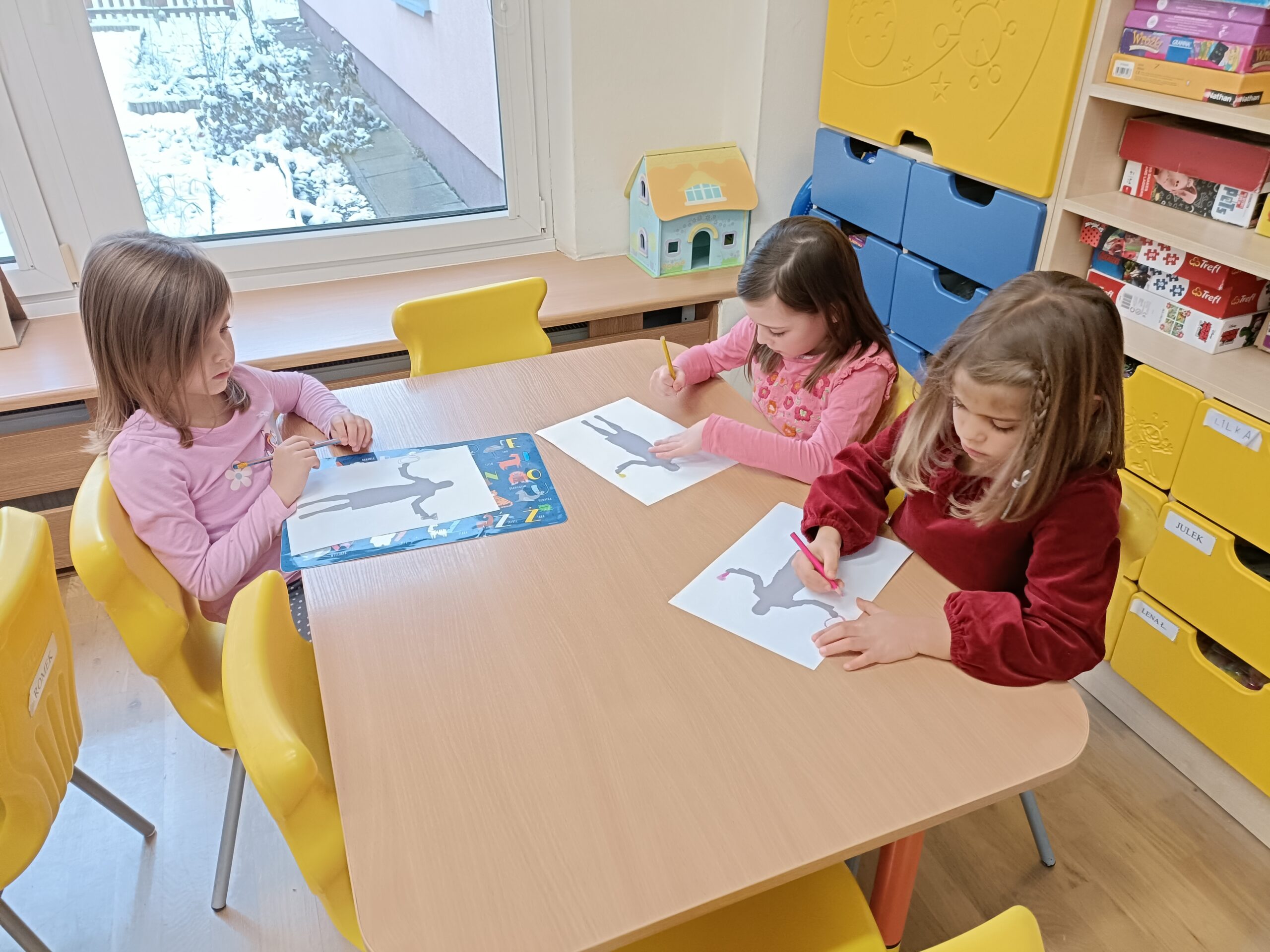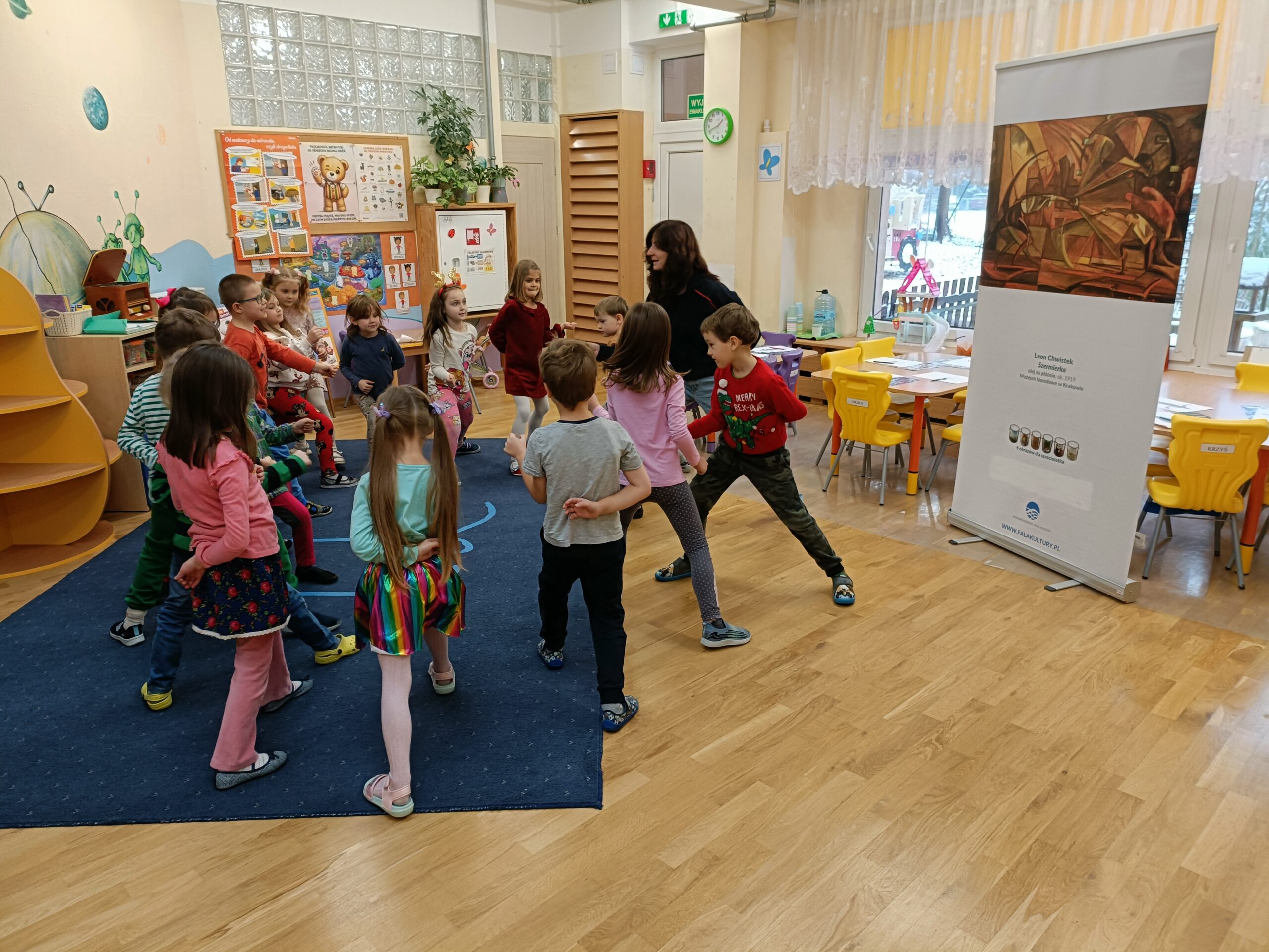 Dnia 24 listopada odbyły się w grupie „Ufoludki „warsztaty artystyczno-edukacyjne z cyklu „Sześć obrazów dla sześciolatków”, których tematem był obraz „Szermierka” Leona Chwistka. Na poczatku zajęć dzieci zastanawiały się nad tym co przedstawia obraz. Z dużym zainteresowaniem przyglądały się dziełu, opisując jego elementy i dzieląc się własnymi spostrzeżeniami. Rozmawiały o tym, czym jest szarmierka oraz uczyły się pierwszego ruchu w szermierce – ćwiczyły „krok szermierczy” i „wypad”. Następnie przedszkolaki próbowały narysować ruch, który pokazywała prowadząca, dzięki czemu dowiedziały się, jak maluje się postacie w ruchu. Na zakończenie dzieci poznały historię powstania obrazu, która okazała się bardzo ciekawa ponieważ artysta w młodości zajmował się szermierką i osiągnął w tej dziedzinie sukcesy, a w 1914 roku stoczył zwycięski pojedynek na szable w obronie honoru narzeczonej.
